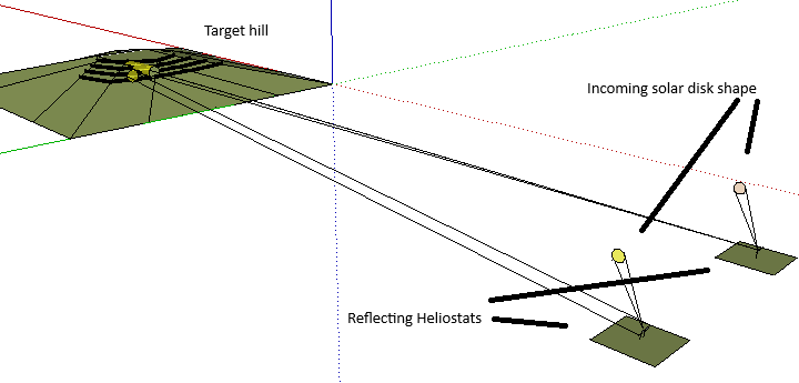 I'm picturing thousands of these heliostats, of solar tracking mirrors, all focused on one hilltop covered with solar heat collectors. Each mirror's sunlight would be miniscule but added all together they could easily equal five or ten suns worth of power, not enough power in total to kill a stray bird, but more than enough over a large collector area to powerfully heat the hill. Thousands of city parking lots and city roofs would lose their sunlight on a hot afternoon. The city would become inherently more livable, with reduced total air conditioning costs. All of that power would be going into the nearby hill for seasonally stored dispatchable power. .