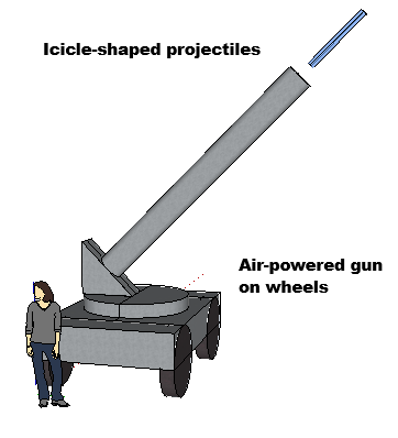 Ice chips without guar gum will fall through flames to the base of the fire better than dispersed tiny water droplets will land on the ground at the base of the fire, refrigerating the ground as they melt. Their cold effectively inhibits the fuel on the ground from burning as each ice chip melts and again as the water evaporates. More of the melted water globules or unmelted ice pieces will reach the ground. In the end a gallon of ice should disrupt the fire better than a gallon of water. The ice sheets are designed not to seriously injure people or hurt tree branches when they land at slow speeds. Rather, larger ice sheets will shatter upon any impact. An ice sheet shaped like a parachute in reverse, with the center bowed downward, will tend to fall at a slow rate of speed and straight down. Small cotton threads in the ice sheet or in any manufactured ice product might give it more internal stability until it shatters. The cotton won't add that much fuel to the fire. For powerful fires, ice cubes of a certain average diameter will certainly plummet successfully through a powerful blaze's updraft, cooling the base of the fire. The cubes may be more dangerous to people and objects on the ground, but for a certain size and heat of conflagration the risk of hitting a live human in the middle of the fireball is close to absolute zero. It's best to keep payloads of ice cubes for hot and for incredibly hot fires in central warehouses. Seriously chilled ice, ice chilled to perhaps 20 degrees below zero Fahrenheit, might cool the base of a wildfire pound for pound even better than 32 degree Fahrenheit ice, and the sliding materials between ice sheets will stay dry and stable at such extremely low temperatures. The Forest Service could build and stockpile thousands of ice block packages well beforehand in regional warehouses perhaps 500 miles apart from each other, drive freezer tractor trailers full of these ice block units as close to a fireline as possible and then airdrop the ice using a parade of radio controlled drones traveling in a loop. I imagine that each ice block gets its own insulating box and the box comes with a fully charged battery pack that powers the drone for one round trip.. Once the special box is locked into a drone plane's fuselage, the drone is able to mechanically pop open the bottom of the box on command, releasing all (or some) of the panes of ice at once. The ice box and attached battery unit must fit aerodynamically and securely into the drone's fuselage. The drone should have a helicopter ability so that it can deposit a used ice container back on a truck and then pick up a fresh load from the back of the next truck. It's possible to design the container tops for easy pickup by the drone and container bottoms for easy locking onto the truck bed. Some sort of funnel design might help with the docking process. A standard firefighting drone may want stubby wings for traveling to and from the fire. The wings might help with the lifting, reducing total energy expenditures per round trip flight. T4. Launching wildfire icicles from trucks I want some way for a fire vehicle to quickly lob ice at a brush fire from a road or a trail. Our goal will be to lob ice at a target at a minimum possible throwing speed to save energy. As before, the ice must hit its target with relatively little impact for safety reasons. The ice piece needs to stay intact when lobbed upwards, but it must fall apart and shatter easily when it lands inside the fire. Our top choices would be long, very thin icicles and ice frisbees.