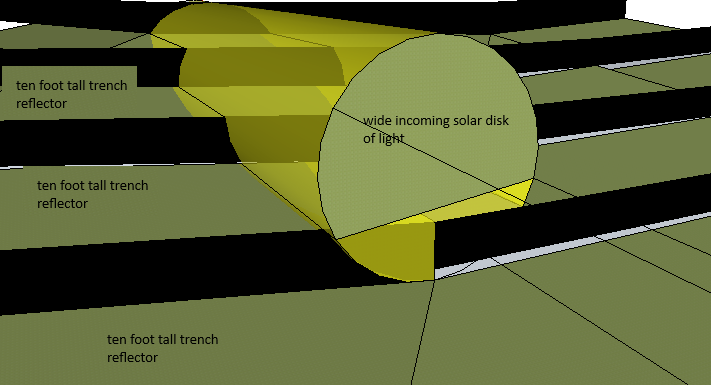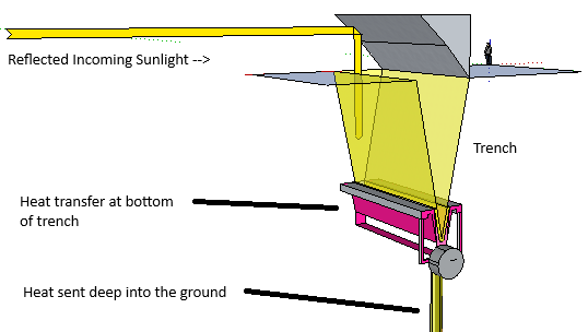 Within the trench the Vee mirror arrangement concentrates the incoming sunlight.