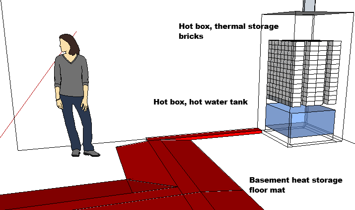 Sand is a long-lived heat storage medium. Unlike water, sand doesn’t cause steam explosions, doesn’t crack pipes in freezing weather and doesn’t ruin any possessions when it uncontrollably leaks out of a pipe and fills the basement. Heat will easily conduct through air-sealed metal containers of sand laced with metal wires. To transport tons of sand into a heat storage appliance in a basement with low labor costs, a loop of sandblasting hoses can be snaked into a building and down staircases.